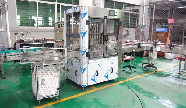 工作流程:人工送瓶---檢測自動攔瓶---灌裝嘴下降---定量分裝灌裝機---自動理蓋上蓋---自動旋蓋(四輪夾旋、壓旋)---在線鋁箔封口(含鋁箔檢測剔除功能)--自動貼標(漿糊、不干膠、熱熔膠可選)---噴碼(油墨、激光可選)---自動分道排瓶---自動裝箱---自動開箱—自動折蓋封箱-----進入碼垛工位、(可選配碼垛、纏繞機)
